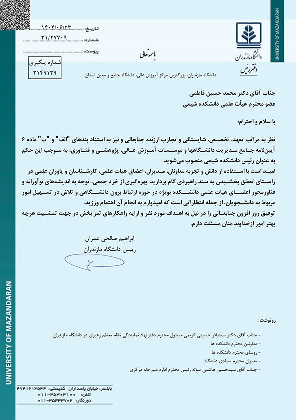رییس دانشکده شیمی دانشگاه مازندران منصوب شد