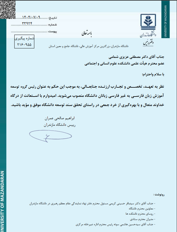 رییس گروه توسعه آموزش زبان فارسی به غیر فارسی زبانان دانشگاه منصوب شد - دانشگاه مازندران